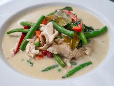 String Beans, Peas & Carrot, Red Bell Pepper and Sweet Basil in Coconut Milk.