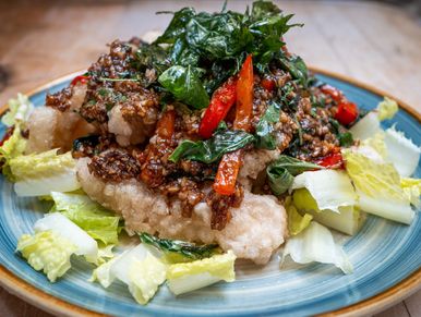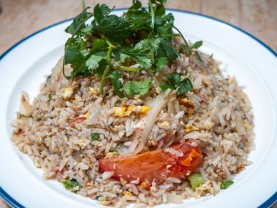 Rice stir-fried with Garlic, Chili, Onions, Bamboo Shoots, Red Bell Pepper and Sweet Basil.