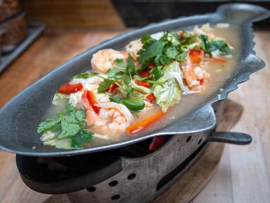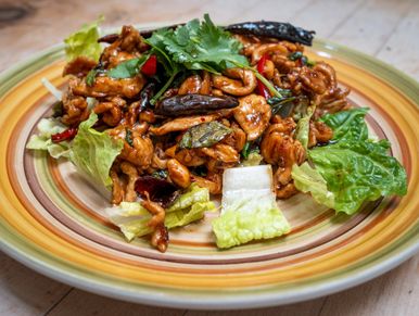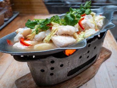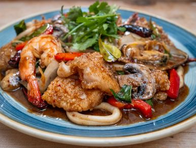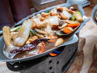 Shrimp, Fish, Squid, Mussels and Scallop stir-fried with Fresh Ginger and Vegetables topped with Cashew Nuts and Dried Chili and served on Hot Stove.
