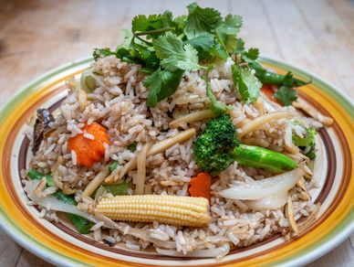 Fried Rice with Egg, Onion, Peas & Carrots.