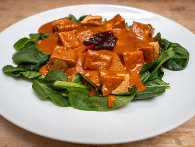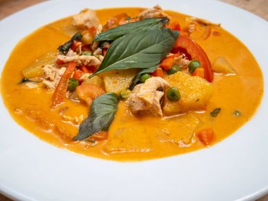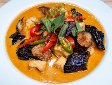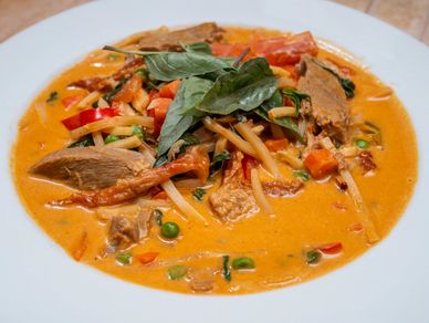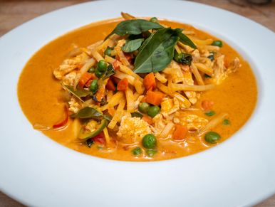 Red Coconut Milk Curry with Pineapple, Tomatoes, Peas & Carrot, Red Bell Pepper and Sweet Basil.