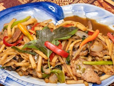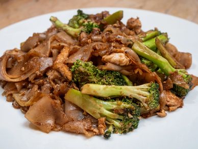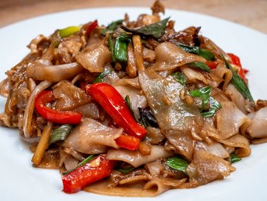 Flat Rice Noodles stir-fried with Chili, Garlic, Bamboo Shoots, Red Bell Pepper, Onions and Sweet Basil.