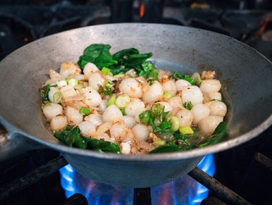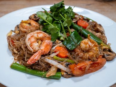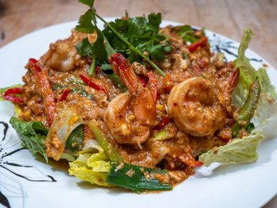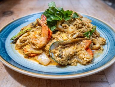 Shrimp, Fish, Squid and Mussels stir-fried with Eggs, Onions, Coconut Milk and Curry