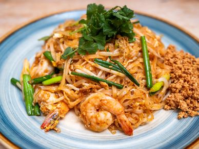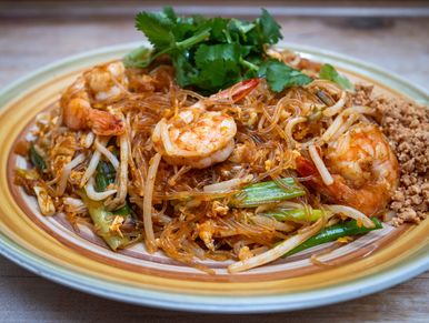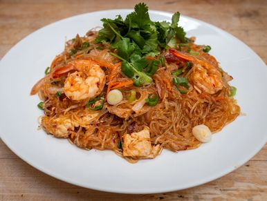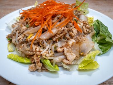 Flat Rice Noodles stir-fried with Chicken, Egg, Bean Sprouts and served on Lettuce.