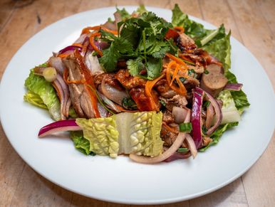 Tasty warm Roasted Duck on Bed of Lettuce in Spicy Lime Dressing.
