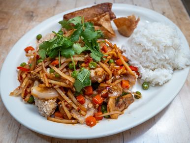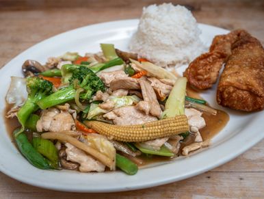 (choice of chicken, pork, beef, tofu, squid or mixed veggies)