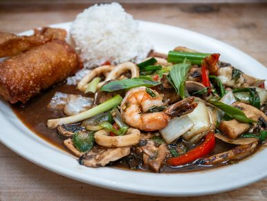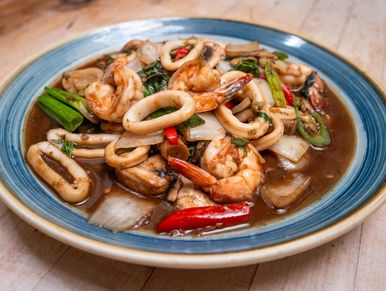 Shrimp and Squid stir-fried with Onions, Mushrooms, Red Bell Pepper and Sweet Basil.