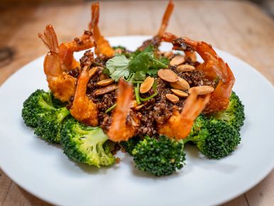 Fried Shrimp topped with Garlic Pepper sauce and Almond.