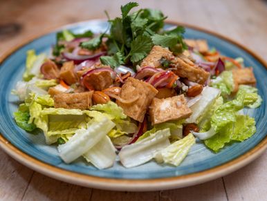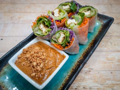 Fresh Vegetables with seasoned Tofu wrapped in soft and chewy Rice Paper served with a Peanut Dressing.