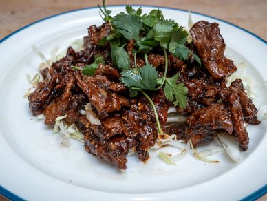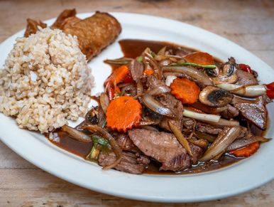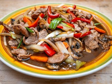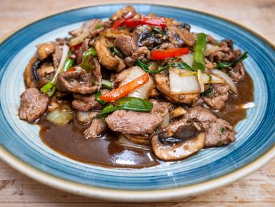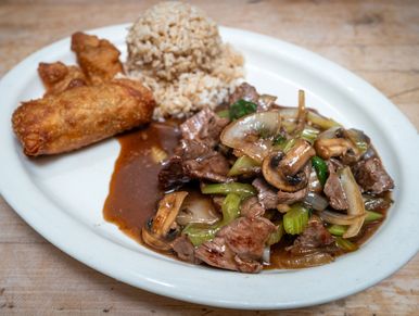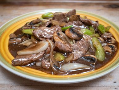 Sliced Beef sautéed with Mushrooms and Onions in Soy Sauce Gravy.