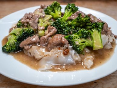 Flat Rice Noodles topped with Broccoli in Oyster Gravy Sauce.