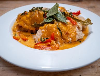 Deep-fried (or Steamed) Fish Fillet in light Sweet Spicy Coconut Milk Curry with Sweet Basil and Red Bell Pepper.