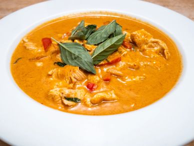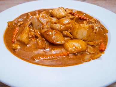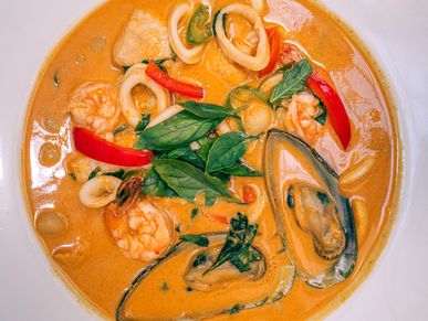 Shrimp, Fish, Squid and Mussels in Light Sweet Spicy Coconut Milk Curry, Sweet Basil and Red Bell Pepper.