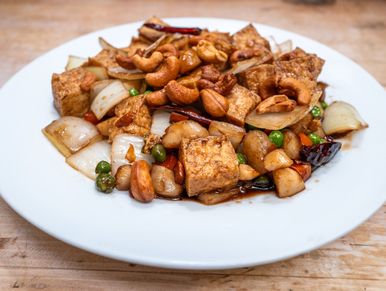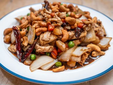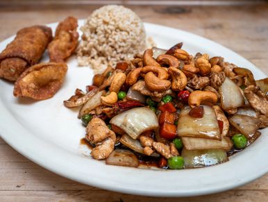 Rice stir-fried with Shrimp, Chicken, Pineapple, Onion, Peas & Carrots topped with Cashew Nuts.