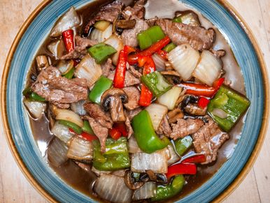 Sliced Beef sautéed with Bell Pepper, Mushrooms and Onions in Gravy Sauce.