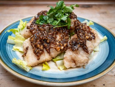 Deep-fried (or Steamed) Fish Fillet topped with a Spicy Mixture of Chili, Onion, Mushrooms, Bamboo Shoots and Red Bell Pepper.
