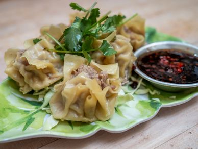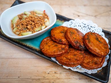 Fish Patties seasoned with Thai Curry and Fresh Herbs. Served with a side of Sweet and Sour Cucumber Sauce topped with Ground Peanut.