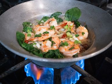 Steamed Shrimp seasoned with Garlic Butter Sauce on a bed of Green Spinach.