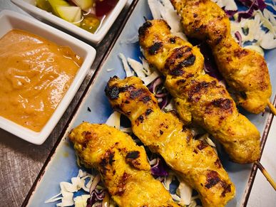 Barbequed on Skewers steeped in Coconut Milk & Curry Paste, served with Peanut Sauce & Cucumber Vinaigrette.